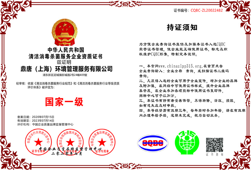 中华人民共和国清洁消毒杀菌服务企业资质证书